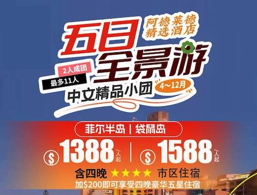 团费价格:五天四晚,四星$ 1688 起/人五星$ 1888 起/人(包含袋鼠岛行程)